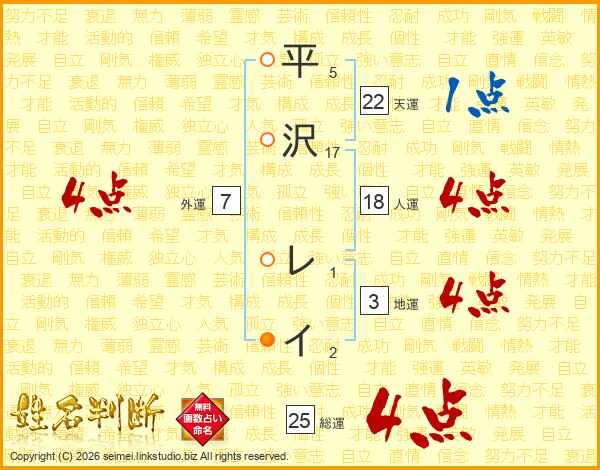 生活面を象徴する運勢です。外部から受ける影響力を表し、結婚運、家庭運や職場、環境への順応性を表します。総運から人運を引いた画数。姓や名が1文字の場合を除く。