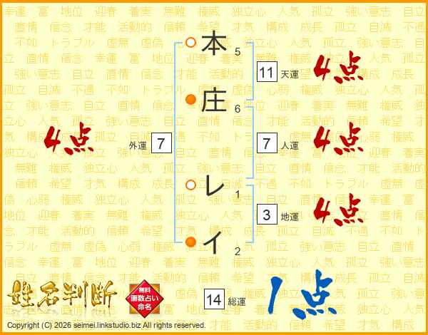 生活面を象徴する運勢です。外部から受ける影響力を表し、結婚運、家庭運や職場、環境への順応性を表します。総運から人運を引いた画数。姓や名が1文字の場合を除く。