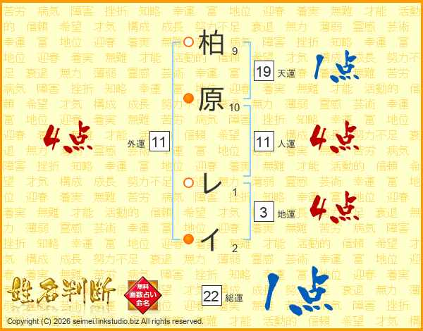 生活面を象徴する運勢です。外部から受ける影響力を表し、結婚運、家庭運や職場、環境への順応性を表します。総運から人運を引いた画数。姓や名が1文字の場合を除く。