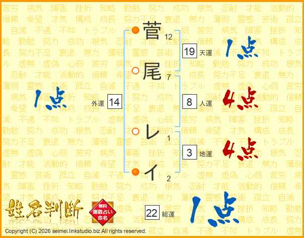 生活面を象徴する運勢です。外部から受ける影響力を表し、結婚運、家庭運や職場、環境への順応性を表します。総運から人運を引いた画数。姓や名が1文字の場合を除く。