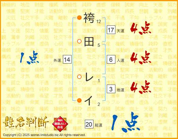 生活面を象徴する運勢です。外部から受ける影響力を表し、結婚運、家庭運や職場、環境への順応性を表します。総運から人運を引いた画数。姓や名が1文字の場合を除く。