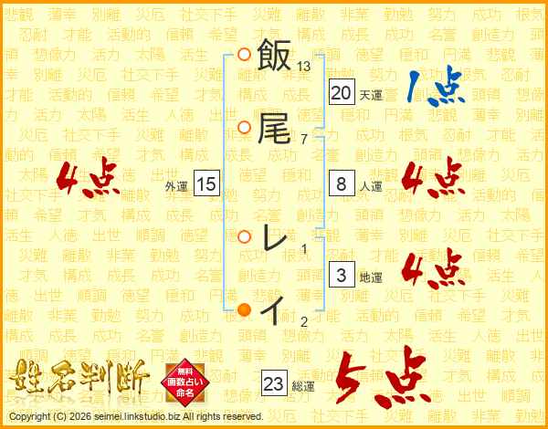 生活面を象徴する運勢です。外部から受ける影響力を表し、結婚運、家庭運や職場、環境への順応性を表します。総運から人運を引いた画数。姓や名が1文字の場合を除く。