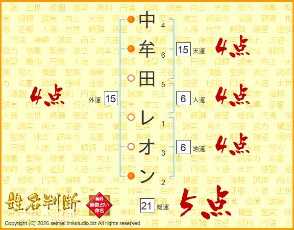 中(4画)牟(6画)田(5画) レ(1画)オ(3画)ン(2画)