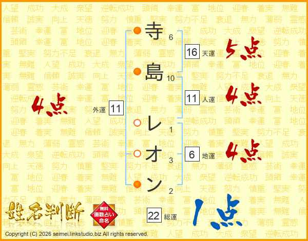 寺島レオンさんの総運は22画の1点!
