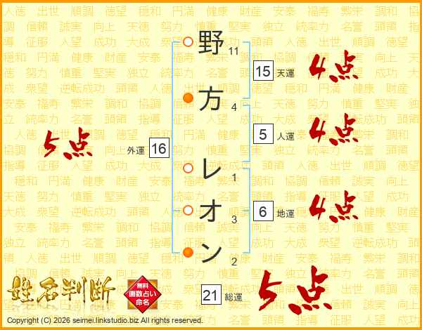 生活面を象徴する運勢です。外部から受ける影響力を表し、結婚運、家庭運や職場、環境への順応性を表します。総運から人運を引いた画数。姓や名が1文字の場合を除く。