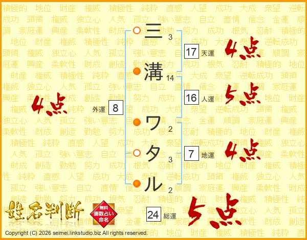 三溝ワタルさんの総運は24画の5点!