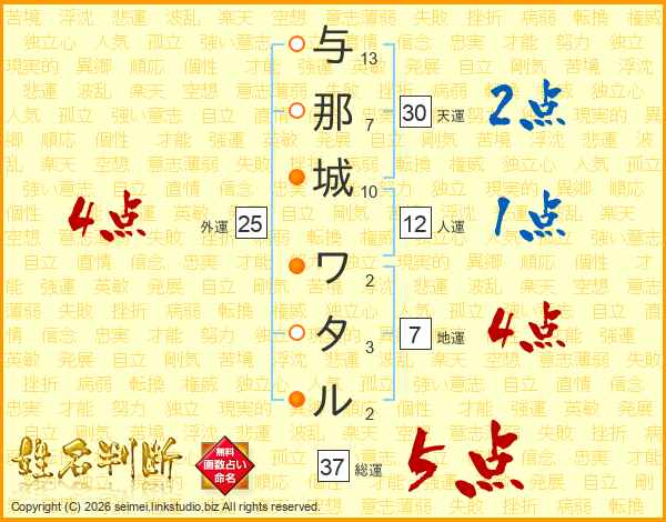 与那城ワタルさんの総運は37画の5点!