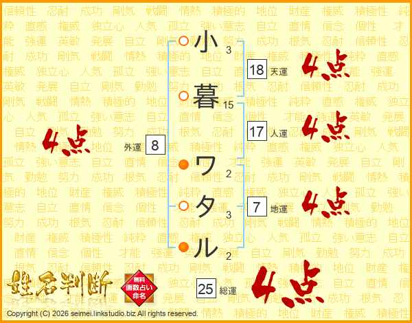 小暮ワタルさんの総運は25画の4点!