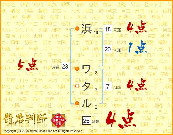 浜(18画) ワ(2画)タ(3画)ル(2画)
