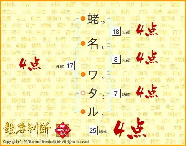 蛯(12画)名(6画) ワ(2画)タ(3画)ル(2画)