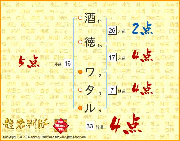 酒(11画)徳(15画) ワ(2画)タ(3画)ル(2画)
