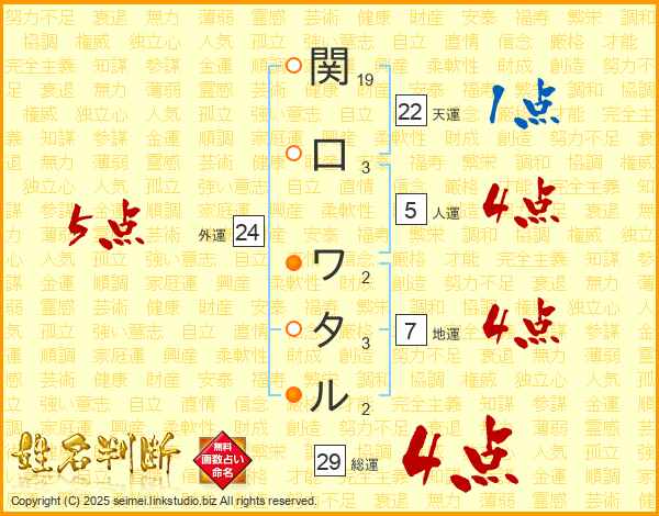 関(19画)口(3画) ワ(2画)タ(3画)ル(2画)