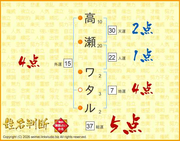 高(10画)瀬(20画) ワ(2画)タ(3画)ル(2画)