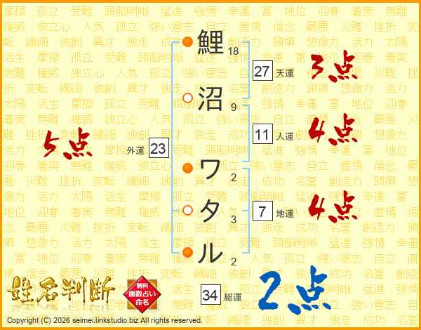 鯉(18画)沼(9画) ワ(2画)タ(3画)ル(2画)
