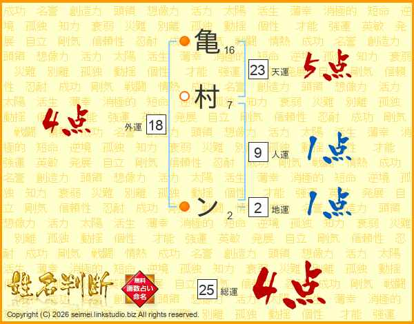 生活面を象徴する運勢です。外部から受ける影響力を表し、結婚運、家庭運や職場、環境への順応性を表します。総運から人運を引いた画数。姓や名が1文字の場合を除く。