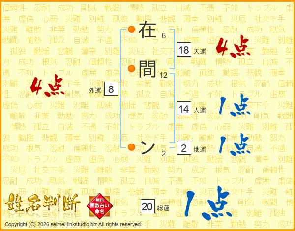 生活面を象徴する運勢です。外部から受ける影響力を表し、結婚運、家庭運や職場、環境への順応性を表します。総運から人運を引いた画数。姓や名が1文字の場合を除く。
