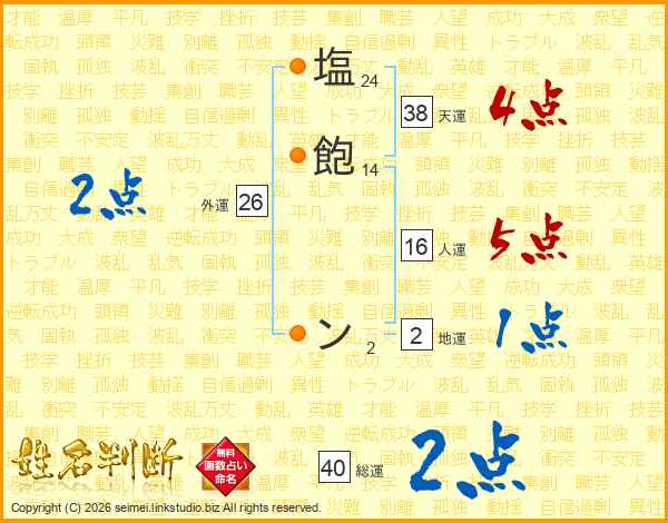 生活面を象徴する運勢です。外部から受ける影響力を表し、結婚運、家庭運や職場、環境への順応性を表します。総運から人運を引いた画数。姓や名が1文字の場合を除く。