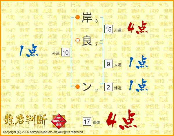 生活面を象徴する運勢です。外部から受ける影響力を表し、結婚運、家庭運や職場、環境への順応性を表します。総運から人運を引いた画数。姓や名が1文字の場合を除く。