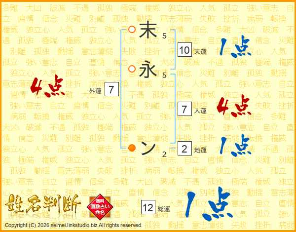 生活面を象徴する運勢です。外部から受ける影響力を表し、結婚運、家庭運や職場、環境への順応性を表します。総運から人運を引いた画数。姓や名が1文字の場合を除く。