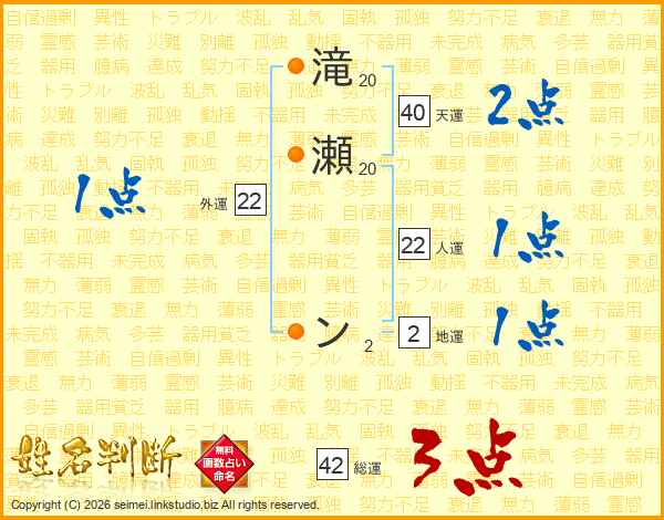 生活面を象徴する運勢です。外部から受ける影響力を表し、結婚運、家庭運や職場、環境への順応性を表します。総運から人運を引いた画数。姓や名が1文字の場合を除く。