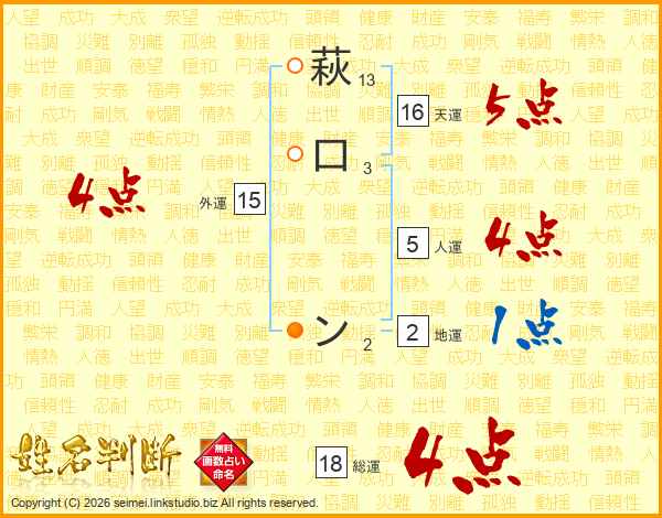 あなたの人生を表す1番重要な運勢です。生涯を通じて影響する総合運となり、主に50歳以降の晩年期に影響を及ぼします。苗字と名前の合計画数。