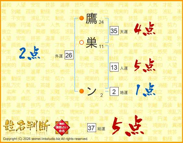 生活面を象徴する運勢です。外部から受ける影響力を表し、結婚運、家庭運や職場、環境への順応性を表します。総運から人運を引いた画数。姓や名が1文字の場合を除く。