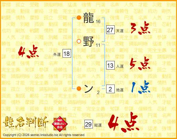 生活面を象徴する運勢です。外部から受ける影響力を表し、結婚運、家庭運や職場、環境への順応性を表します。総運から人運を引いた画数。姓や名が1文字の場合を除く。