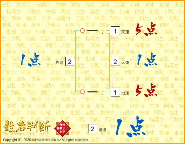 生活面を象徴する運勢です。外部から受ける影響力を表し、結婚運、家庭運や職場、環境への順応性を表します。総運から人運を引いた画数。姓や名が1文字の場合を除く。