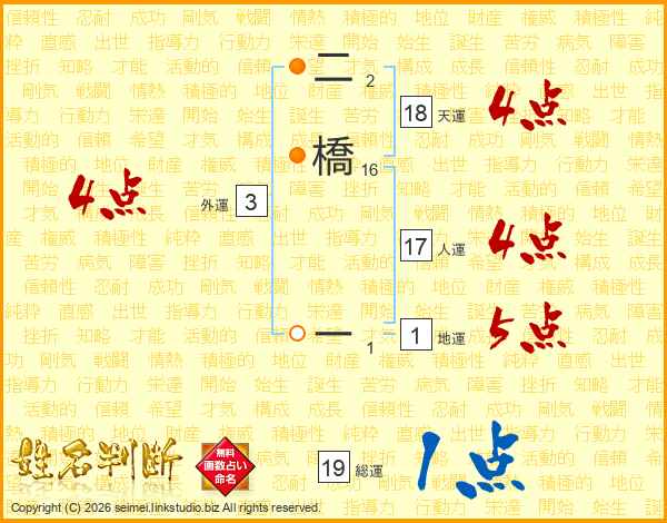 生活面を象徴する運勢です。外部から受ける影響力を表し、結婚運、家庭運や職場、環境への順応性を表します。総運から人運を引いた画数。姓や名が1文字の場合を除く。