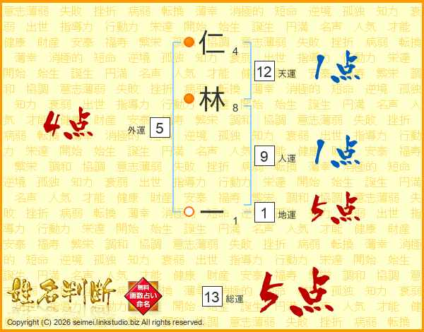 生活面を象徴する運勢です。外部から受ける影響力を表し、結婚運、家庭運や職場、環境への順応性を表します。総運から人運を引いた画数。姓や名が1文字の場合を除く。