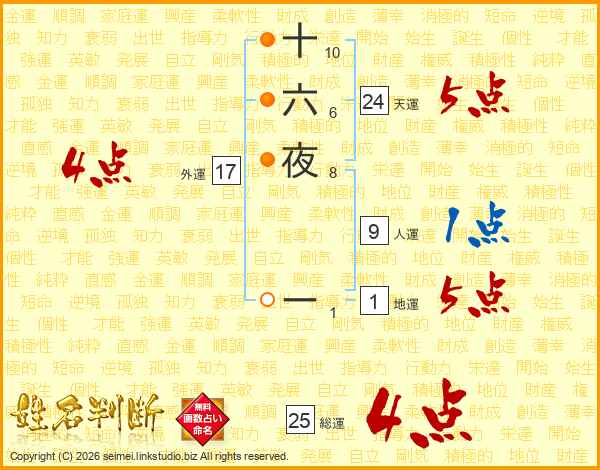 家系が持つ宿命的な運勢を表します。祖先から受け継いだ苗字ですので自分の力が及びません。家柄を象徴します。苗字の合計画数。