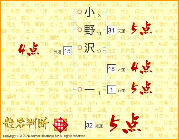 生活面を象徴する運勢です。外部から受ける影響力を表し、結婚運、家庭運や職場、環境への順応性を表します。総運から人運を引いた画数。姓や名が1文字の場合を除く。
