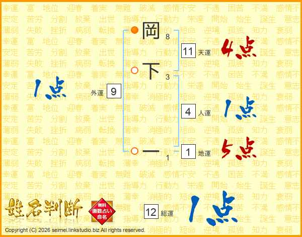 生活面を象徴する運勢です。外部から受ける影響力を表し、結婚運、家庭運や職場、環境への順応性を表します。総運から人運を引いた画数。姓や名が1文字の場合を除く。