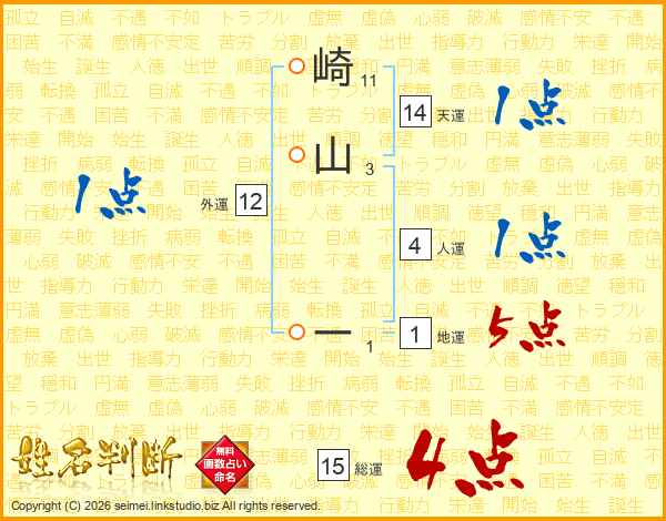 生活面を象徴する運勢です。外部から受ける影響力を表し、結婚運、家庭運や職場、環境への順応性を表します。総運から人運を引いた画数。姓や名が1文字の場合を除く。