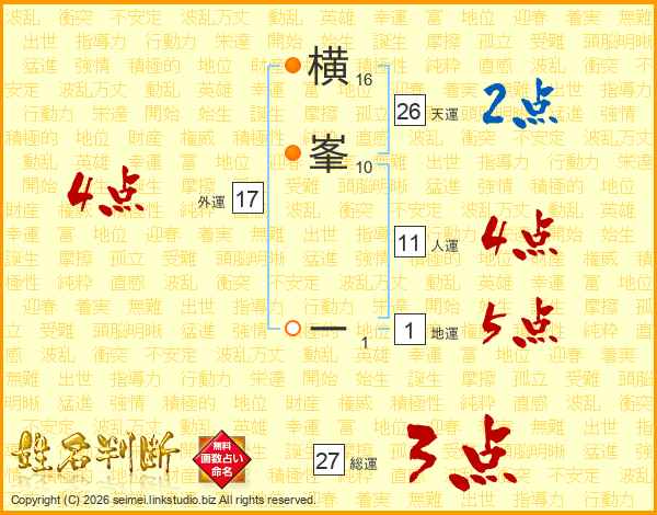 生活面を象徴する運勢です。外部から受ける影響力を表し、結婚運、家庭運や職場、環境への順応性を表します。総運から人運を引いた画数。姓や名が1文字の場合を除く。