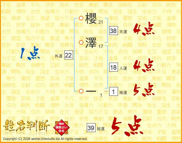 櫻澤ーさんの天運は38画の4点!