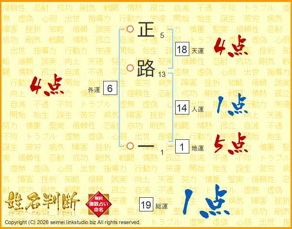 あなたの人生を表す1番重要な運勢です。生涯を通じて影響する総合運となり、主に50歳以降の晩年期に影響を及ぼします。苗字と名前の合計画数。