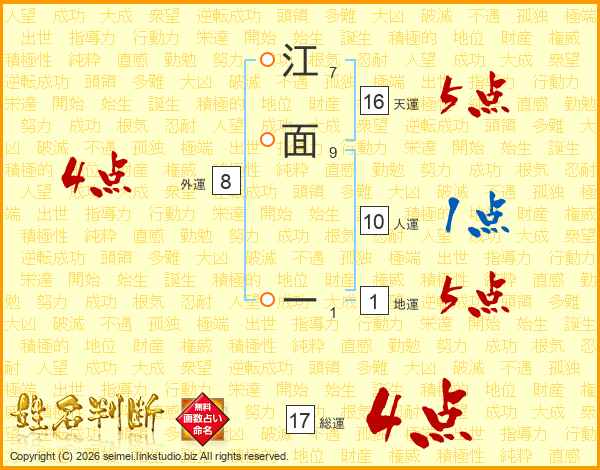 生活面を象徴する運勢です。外部から受ける影響力を表し、結婚運、家庭運や職場、環境への順応性を表します。総運から人運を引いた画数。姓や名が1文字の場合を除く。