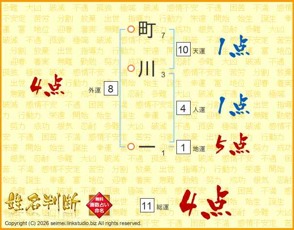 生活面を象徴する運勢です。外部から受ける影響力を表し、結婚運、家庭運や職場、環境への順応性を表します。総運から人運を引いた画数。姓や名が1文字の場合を除く。