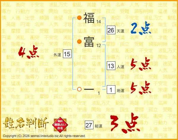 生活面を象徴する運勢です。外部から受ける影響力を表し、結婚運、家庭運や職場、環境への順応性を表します。総運から人運を引いた画数。姓や名が1文字の場合を除く。