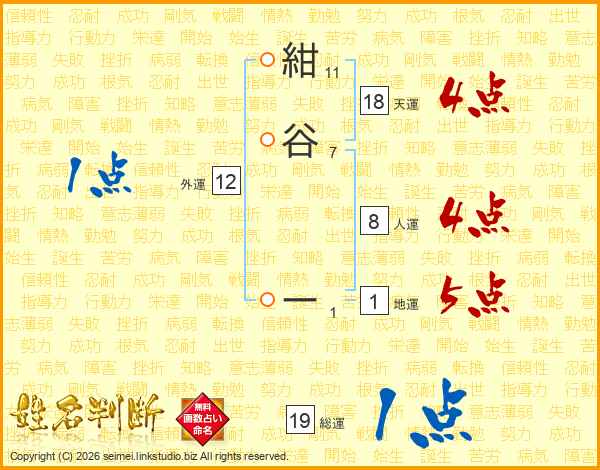 あなたの人生を表す1番重要な運勢です。生涯を通じて影響する総合運となり、主に50歳以降の晩年期に影響を及ぼします。苗字と名前の合計画数。