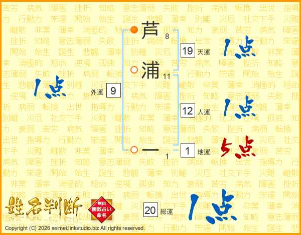 生活面を象徴する運勢です。外部から受ける影響力を表し、結婚運、家庭運や職場、環境への順応性を表します。総運から人運を引いた画数。姓や名が1文字の場合を除く。