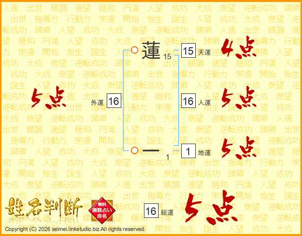 生活面を象徴する運勢です。外部から受ける影響力を表し、結婚運、家庭運や職場、環境への順応性を表します。総運から人運を引いた画数。姓や名が1文字の場合を除く。