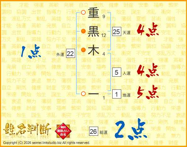 あなたの人生を表す1番重要な運勢です。生涯を通じて影響する総合運となり、主に50歳以降の晩年期に影響を及ぼします。苗字と名前の合計画数。