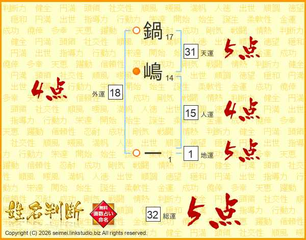 生活面を象徴する運勢です。外部から受ける影響力を表し、結婚運、家庭運や職場、環境への順応性を表します。総運から人運を引いた画数。姓や名が1文字の場合を除く。
