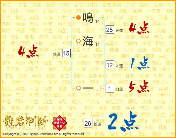鳴海ーさんの総運は26画の2点!
