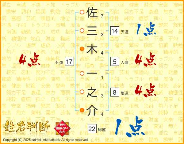 佐(7画)三(3画)木(4画) 一(1画)之(3画)介(4画)