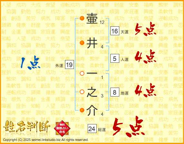 生活面を象徴する運勢です。外部から受ける影響力を表し、結婚運、家庭運や職場、環境への順応性を表します。総運から人運を引いた画数。姓や名が1文字の場合を除く。