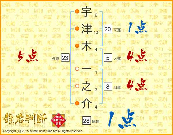 宇(6画)津(10画)木(4画) 一(1画)之(3画)介(4画)