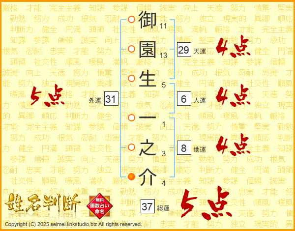 御(11画)園(13画)生(5画) 一(1画)之(3画)介(4画)